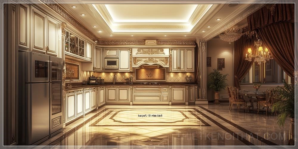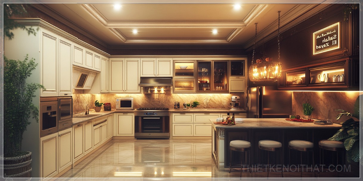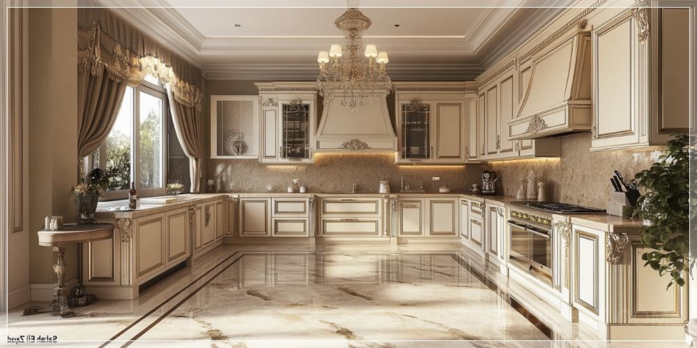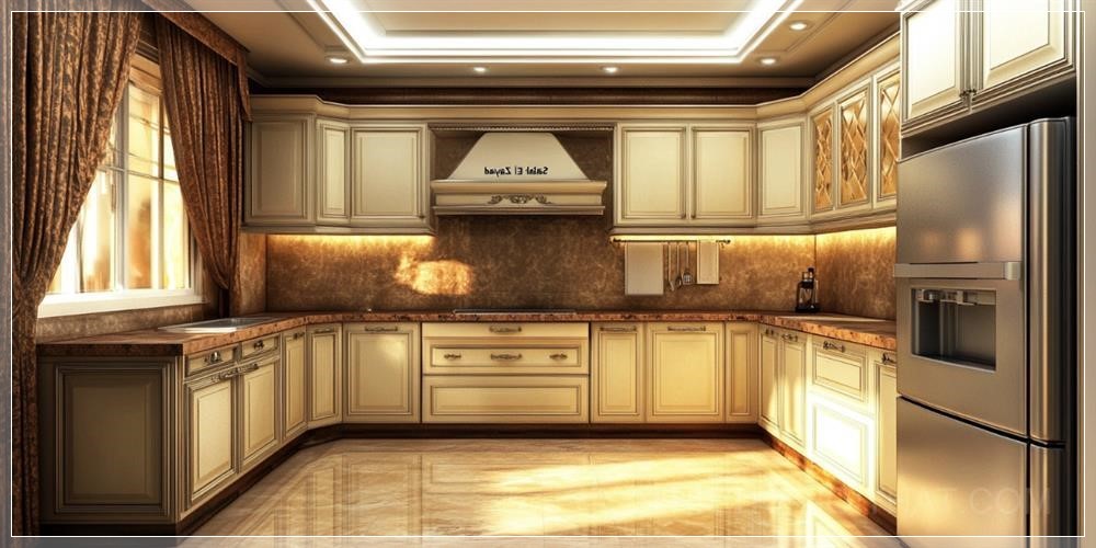Bếp cổ điển màu nâu be với ánh sáng gián tiếp. Trang bị đầy đủ các thiết bị. Ghi tên Salah El Zayad ở góc trái dưới.