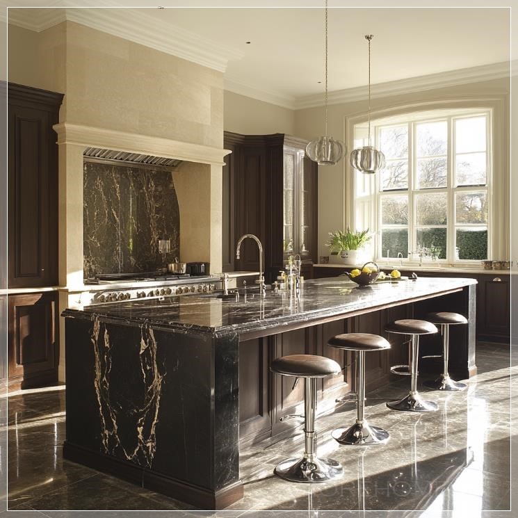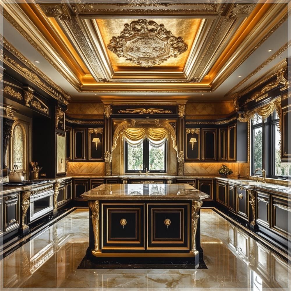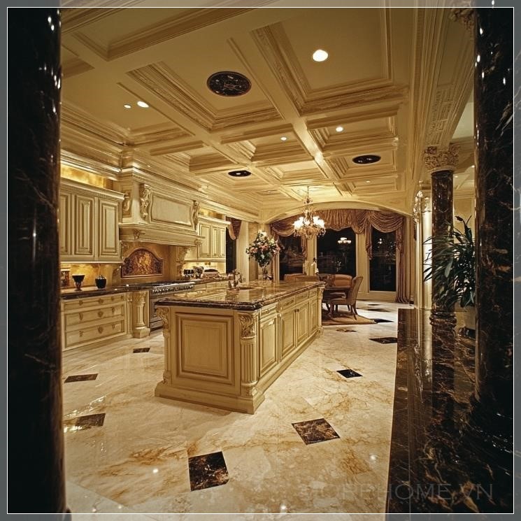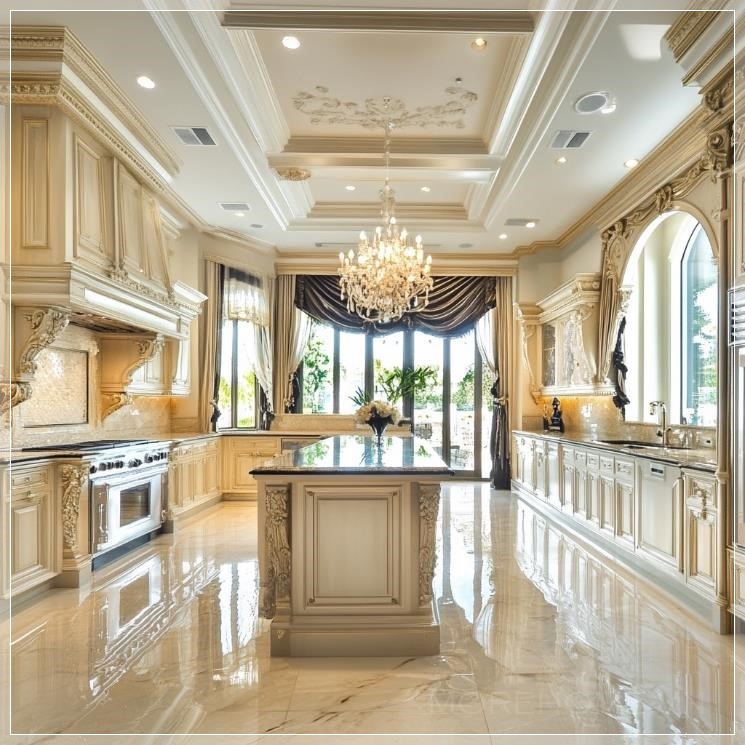 Nhà bếp rất sang trọng với các tủ bếp trắng tinh tế, mặt đá hoa cương đen bóng, thiết bị bếp bằng thép không gỉ, và đèn chùm pha lê lấp lánh treo trên trần. Không gian rộng mở, với cửa sổ lớn nhìn ra khu vườn xanh tươi, ánh sáng tự nhiên chiếu sáng không gian. Sàn nhà được lát gỗ màu sáng, tạo nên vẻ đẹp ấm cúng và tinh tế cho không gian bếp.