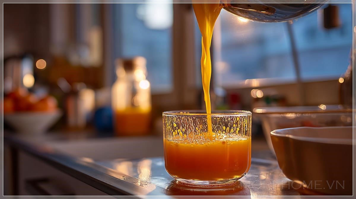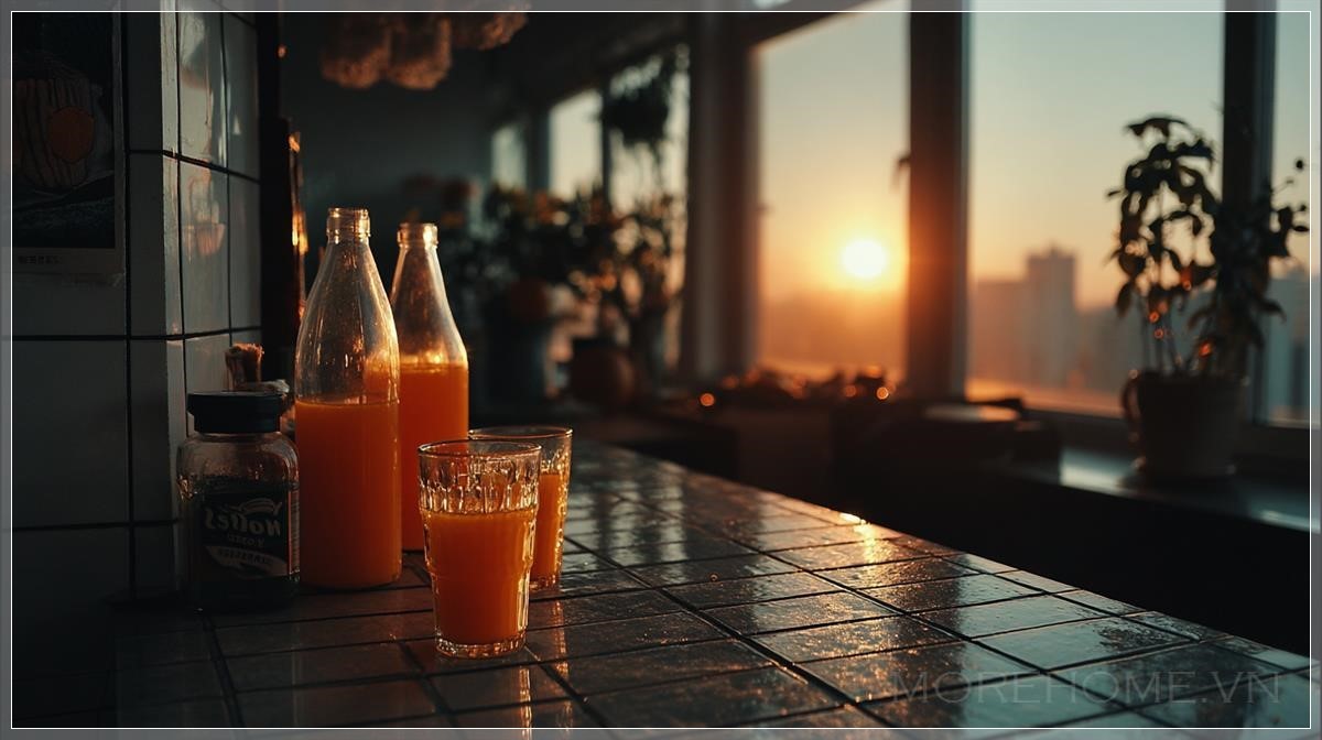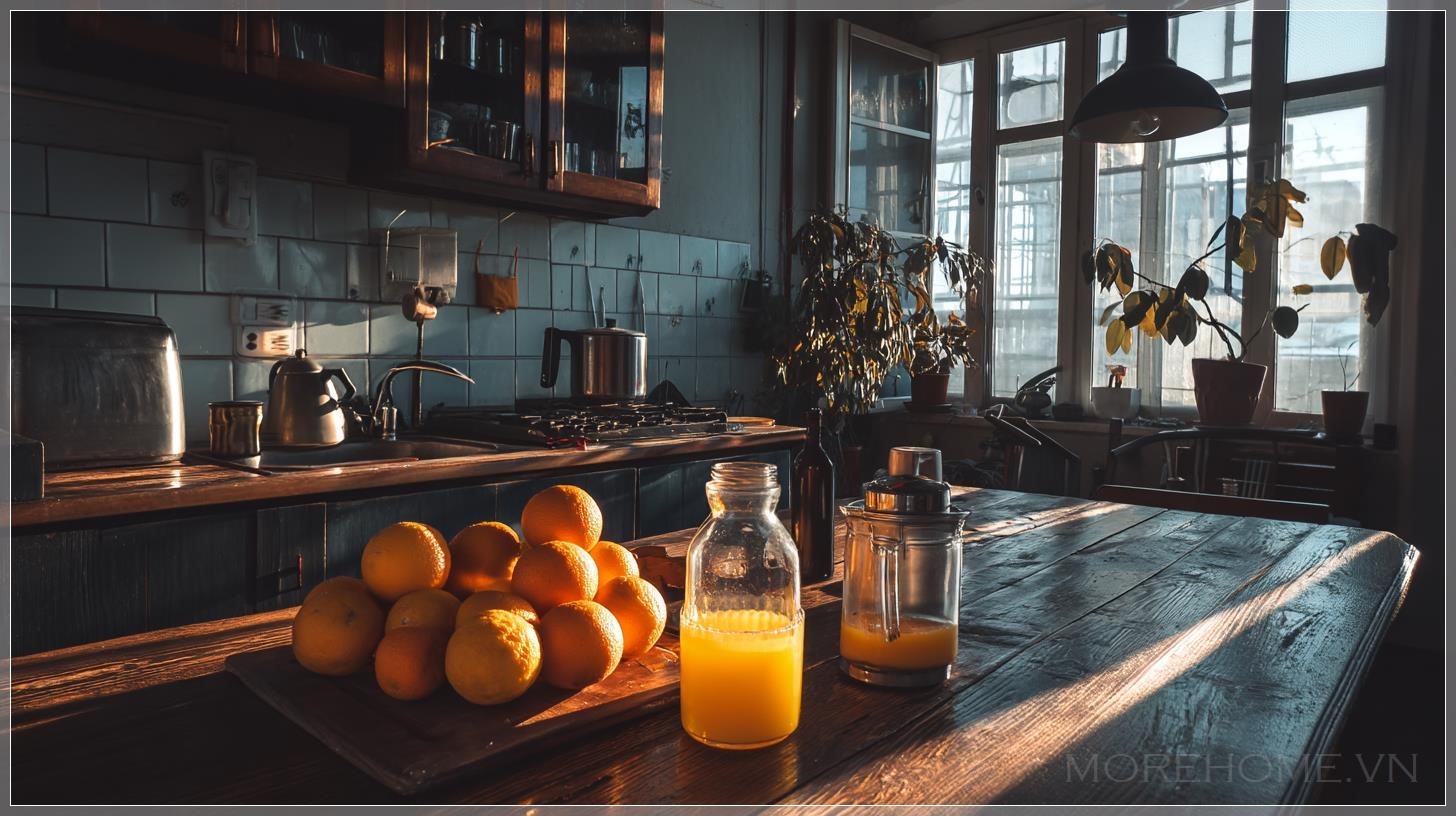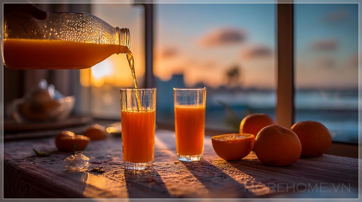 Sáng sớm khi bình minh ló dạng, nước cam tươi đang được vắt trong một căn hộ đẹp tại thành phố. Liên hệ: https://zalo.me/morehomevietnam