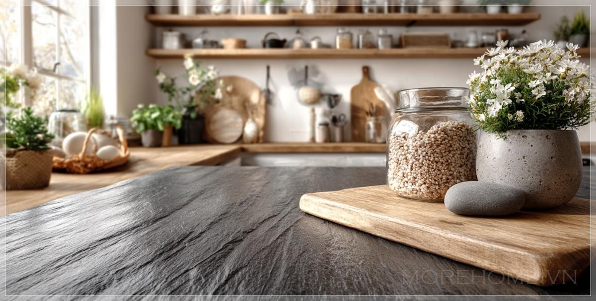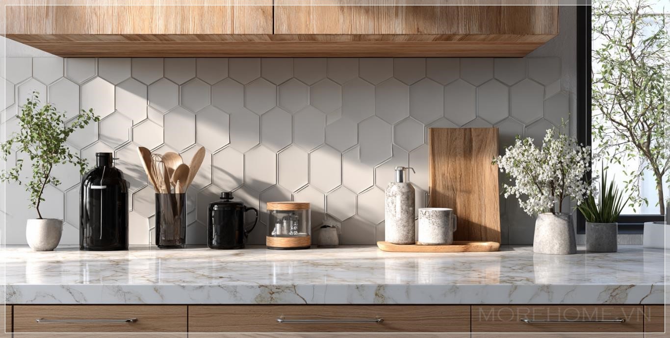 Một trong những điểm nhấn của không gian bếp hiện đại là sự lựa chọn các vật liệu như gỗ tự nhiên kết hợp với các bề mặt nhựa cao cấp. Bề mặt bàn bếp làm từ nhựa plastic, với đặc tính dễ vệ sinh và bền bỉ, là một trong những sự lựa chọn phổ biến. Những vật liệu này không chỉ mang lại cảm giác sang trọng mà còn đảm bảo độ bền, dễ bảo trì. Màu sắc của không gian bếp hiện đại thường thiên về những gam màu nhẹ nhàng, thanh lịch như trắng, xám, kết hợp cùng những chi tiết bằng gỗ tự nhiên để tạo nên không gian hài hòa và ấm cúng.