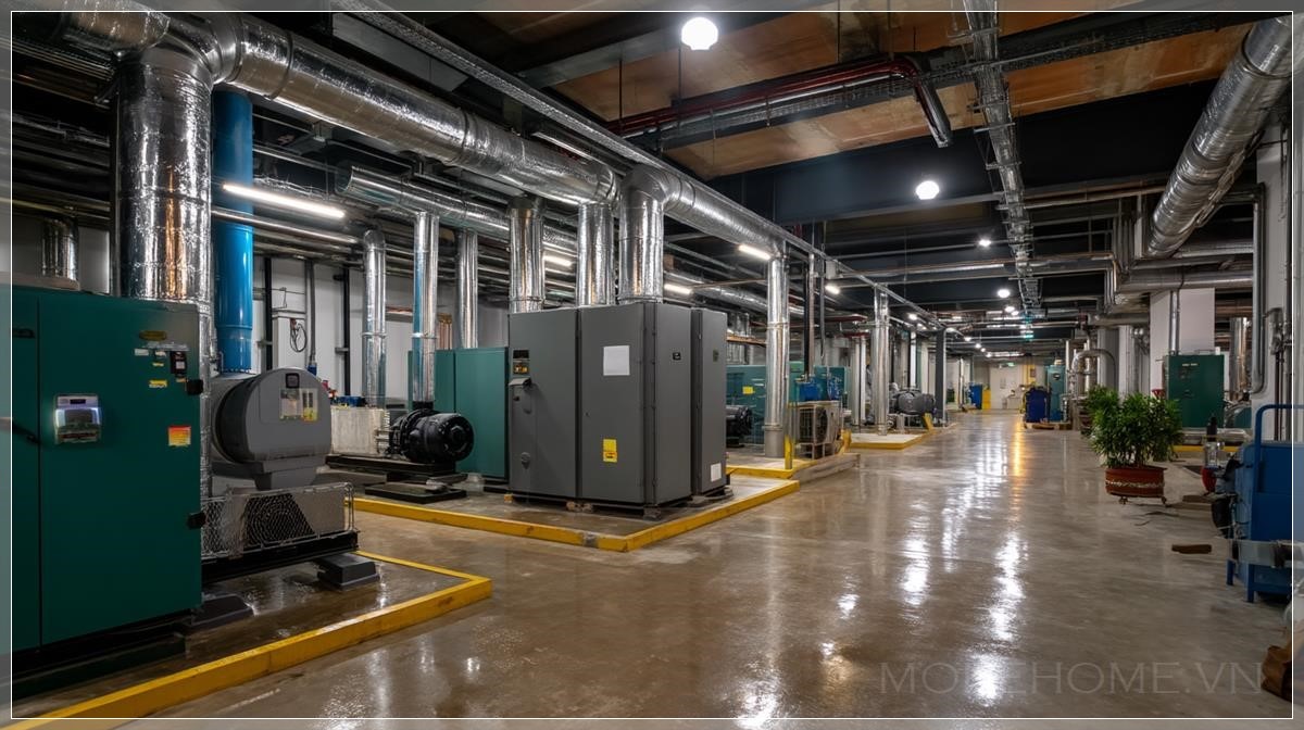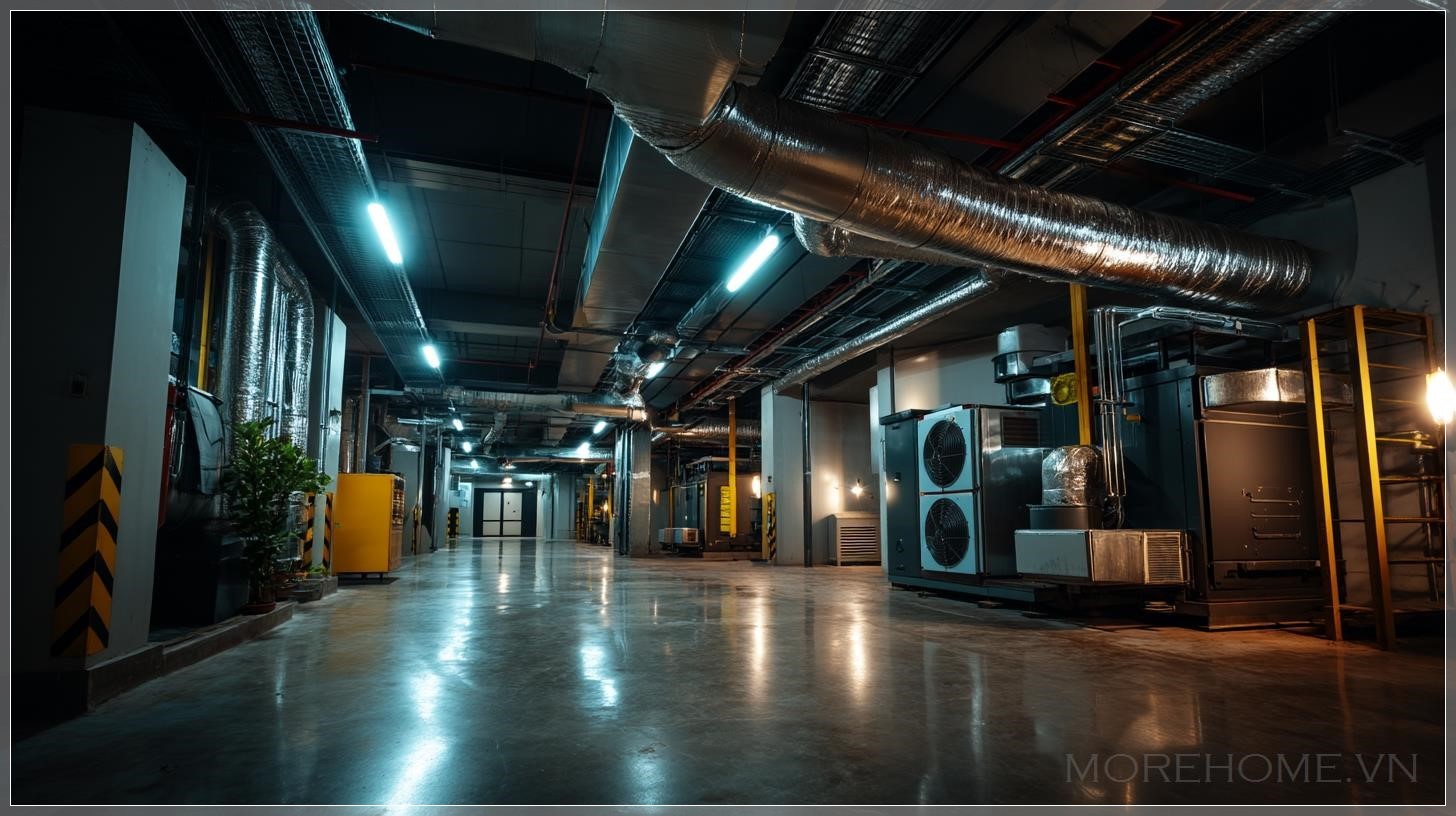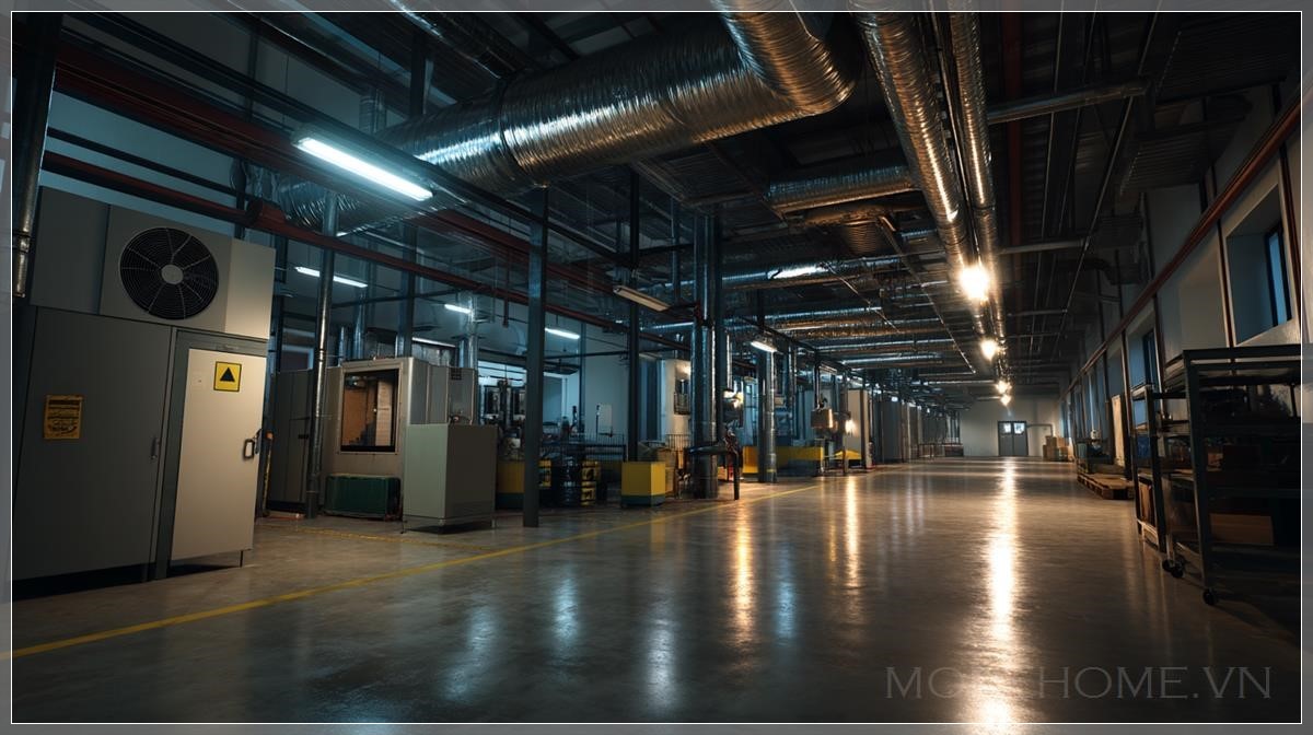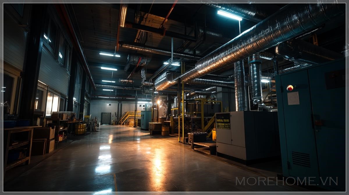 Không gian công nghiệp hiện đại không chỉ chú trọng đến vẻ bề ngoài mà còn đáp ứng nhu cầu chức năng cao trong sinh hoạt hàng ngày. Các yếu tố như sàn bê tông sạch sẽ, các hệ thống ống dẫn thông gió hay các quạt công nghiệp lớn không chỉ mang lại tính thẩm mỹ mà còn góp phần vào hiệu quả sử dụng không gian. Mỗi chi tiết trong không gian này đều được tính toán kỹ lưỡng, từ các bề mặt kim loại sáng bóng đến ánh sáng mạnh mẽ, tạo nên một tổng thể sống động và đầy ấn tượng.