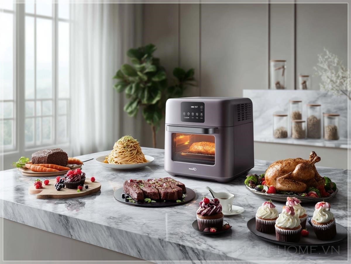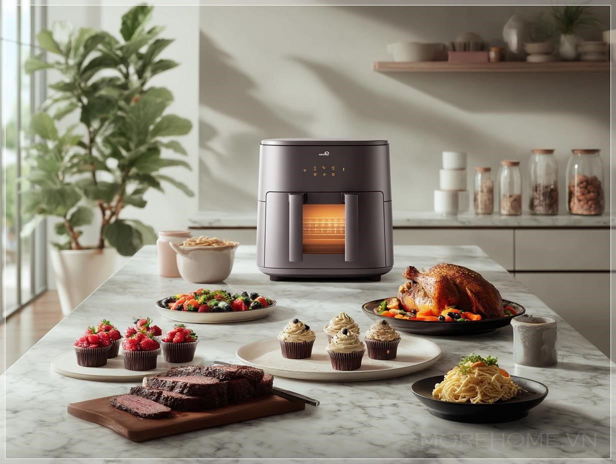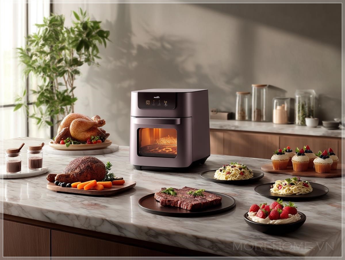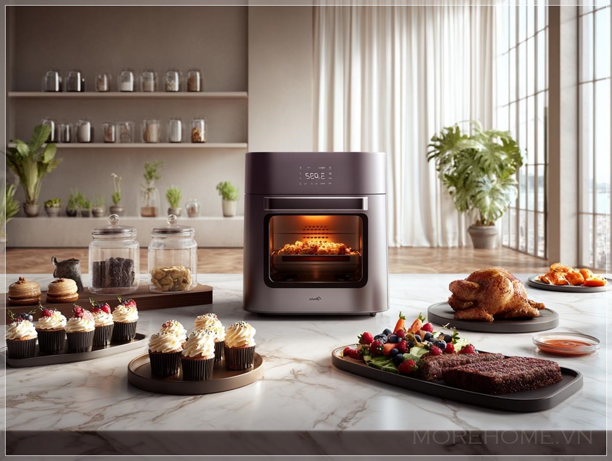 Trong không gian bếp hiện đại, sự kết hợp giữa công nghệ và thiết kế không chỉ nâng cao hiệu quả sử dụng mà còn mang đến vẻ đẹp tinh tế, hiện đại. Một ví dụ nổi bật là chiếc Midea air fryer đa chức năng, được đặt tại một căn bếp sang trọng với mặt đảo bếp bằng đá marble màu xám. Cùng với những món ăn thượng hạng như gà nướng nguyên con, pasta kem, steak lát mỏng, các món tráng miệng như cupcake, chiếc air fryer này không chỉ là một dụng cụ nhà bếp mà còn là một phần của thiết kế nội thất, tạo ra không gian bếp vô cùng ấn tượng.