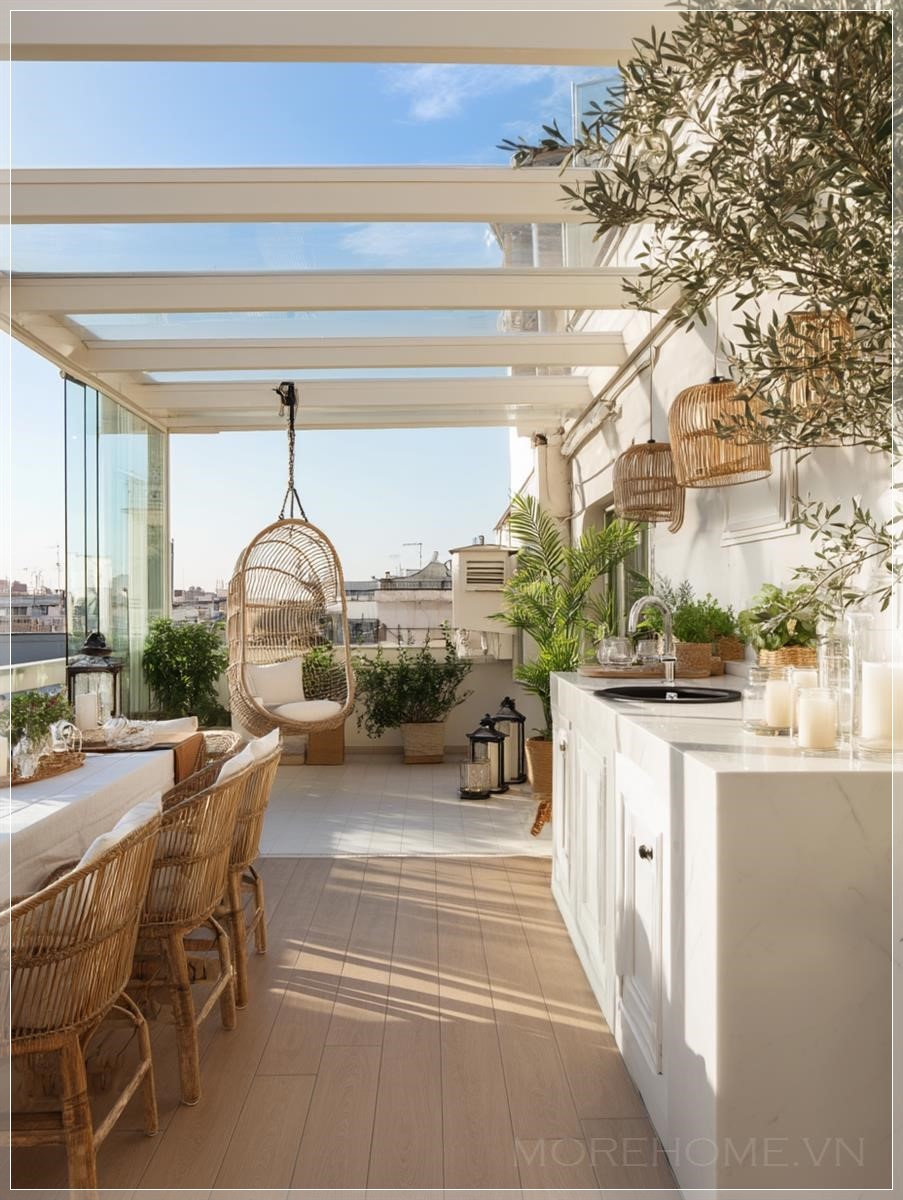 Có thể nhận thấy rằng thiết kế này không chỉ chú trọng đến vẻ đẹp thẩm mỹ mà còn tối ưu hóa tính năng sử dụng. Cùng với chiếc bàn làm việc ngoài trời, không gian này còn được trang bị bồn rửa tay, giúp cho việc làm việc ngoài trời trở nên tiện lợi hơn bao giờ hết. Bên cạnh đó, chiếc ghế treo lơ lửng dưới ánh sáng dịu nhẹ của buổi chiều làm tăng thêm sự thoải mái, tạo một không gian thư giãn lý tưởng. Mỗi chi tiết như bàn ăn, đèn chiếu sáng, và các chậu cây cũng đều góp phần tạo nên không gian sống động, hòa quyện với thiên nhiên xung quanh.