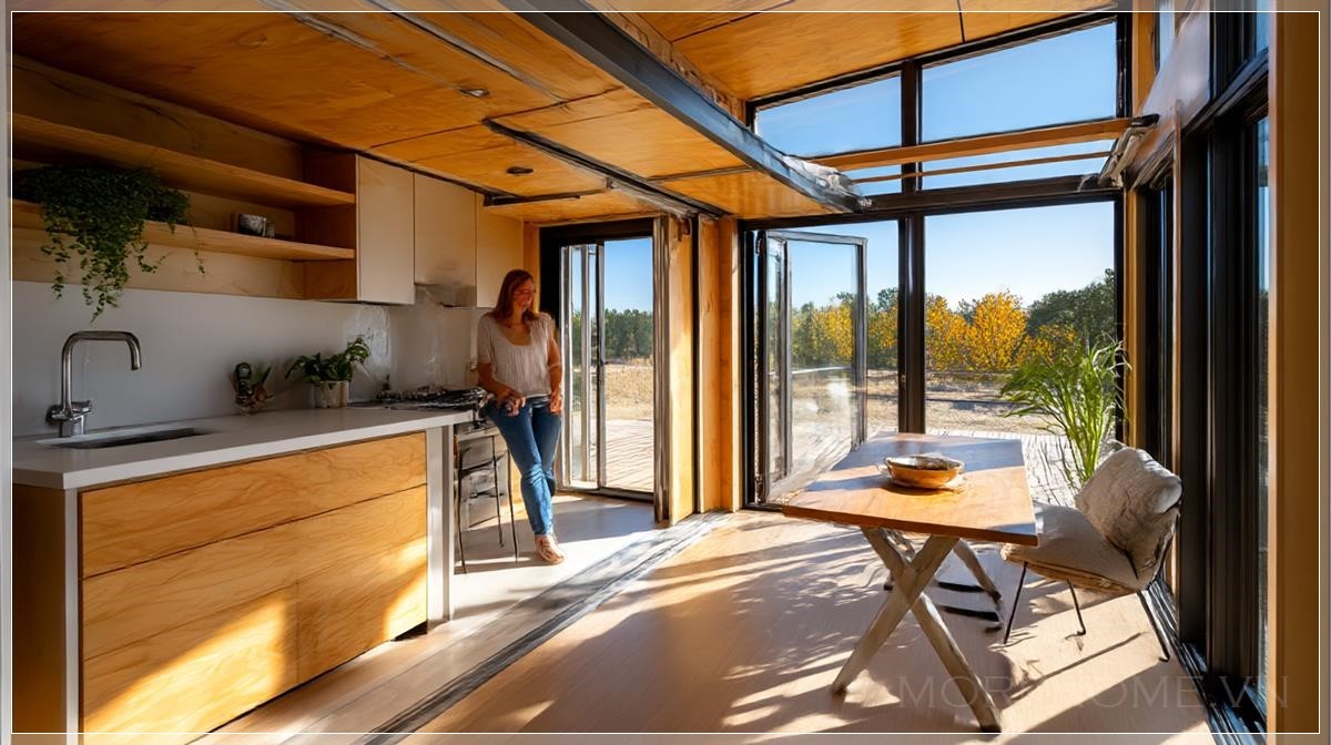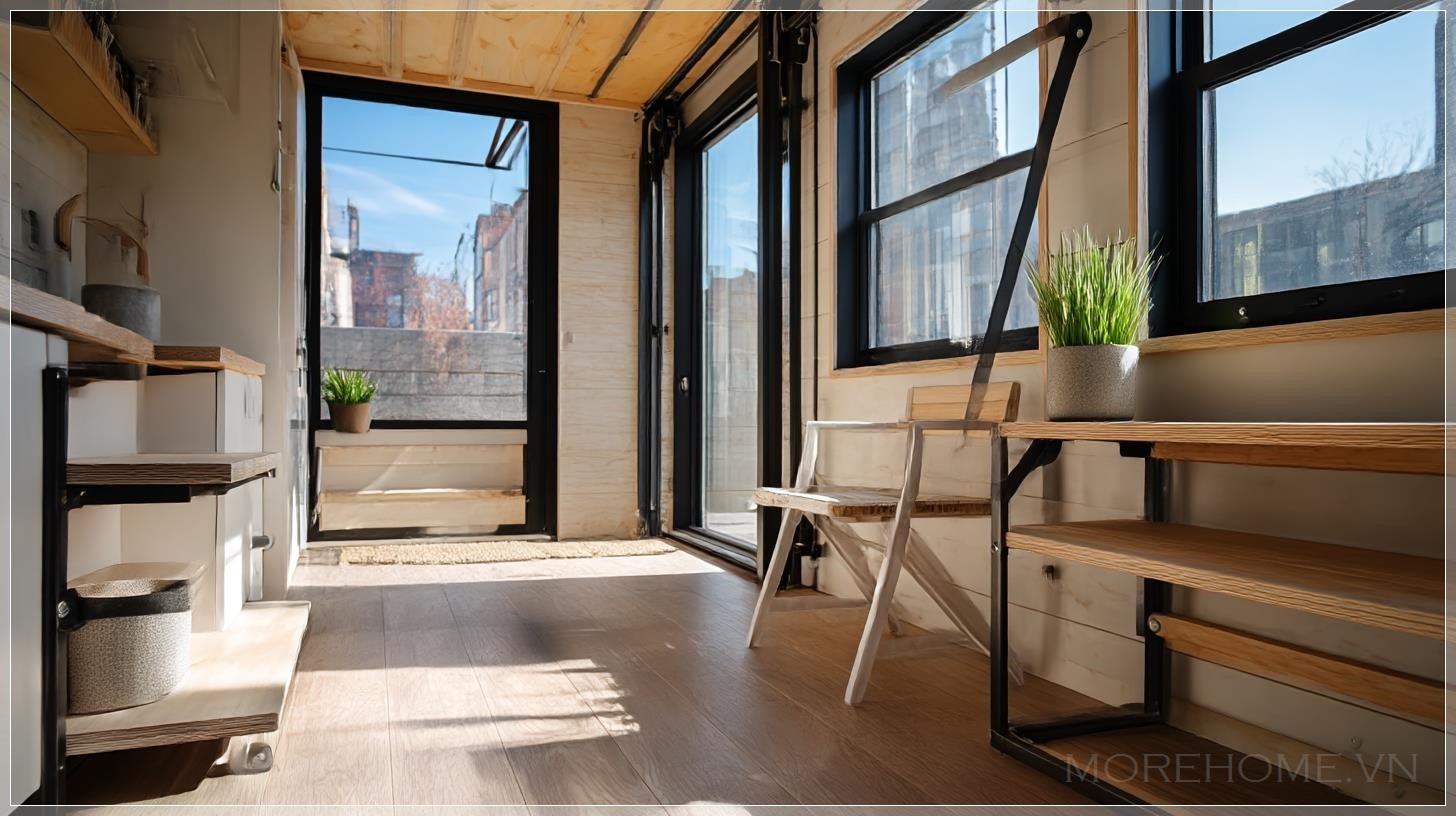 Với ngôi nhà nhỏ này, các món đồ nội thất như giường, bàn làm việc hay tủ đều có thể gập lại, được thiết kế để trượt ra từ các ray dọc. Khi không sử dụng, chúng được gấp gọn, giúp không gian sống trở nên rộng rãi và thoáng đãng hơn. Hệ thống ray dọc được lắp đặt một cách tinh tế, không chỉ giúp tiết kiệm không gian mà còn dễ dàng thao tác. Bức ảnh ghi lại khoảnh khắc chuyển động của quá trình thay đổi không gian này, với ánh sáng ban ngày chiếu vào, tạo nên một khung cảnh sống động và tràn đầy năng lượng. Đó là sự kết hợp hoàn hảo giữa thiết kế hiện đại và tính năng sử dụng cao.