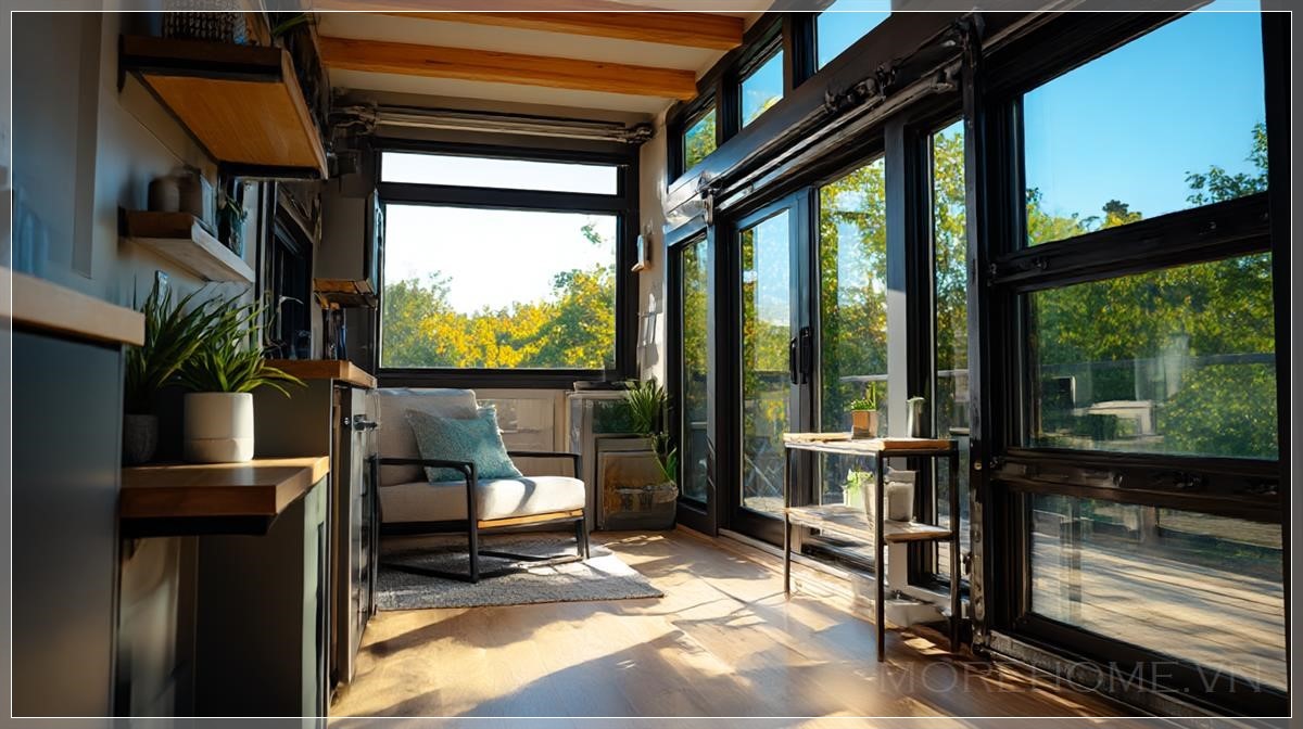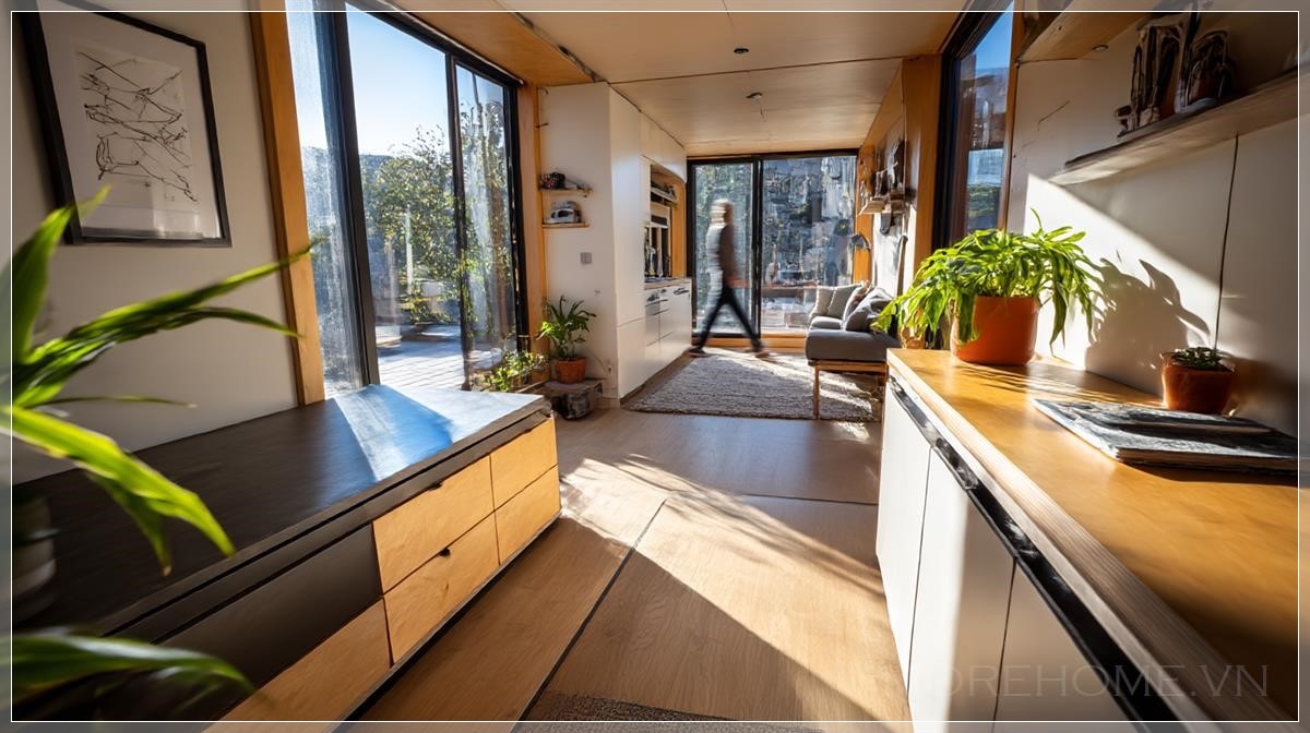 Được chụp bằng chiếc Sony FX30 với ống kính 24mm f/1.8, bức ảnh mang đến một cái nhìn sắc nét và chân thực về ngôi nhà mini. Ánh sáng tự nhiên từ cửa sổ lớn khiến không gian trở nên ấm áp và dễ chịu. Chúng ta có thể cảm nhận rõ ràng sự chuyển mình của không gian qua từng khoảnh khắc, khi các đồ nội thất gập lại và kéo ra, mang lại cảm giác như thể ngôi nhà thay đổi ngay trước mắt chúng ta. Đây là một ví dụ tiêu biểu của lối sống hiện đại, nơi mà mỗi góc nhỏ trong ngôi nhà đều có thể được tối ưu hóa cho cuộc sống tiện nghi và linh hoạt.