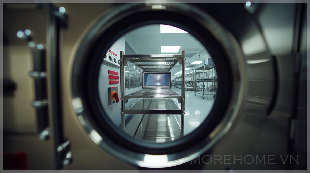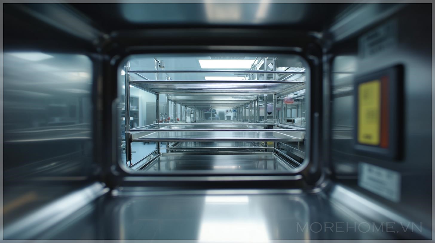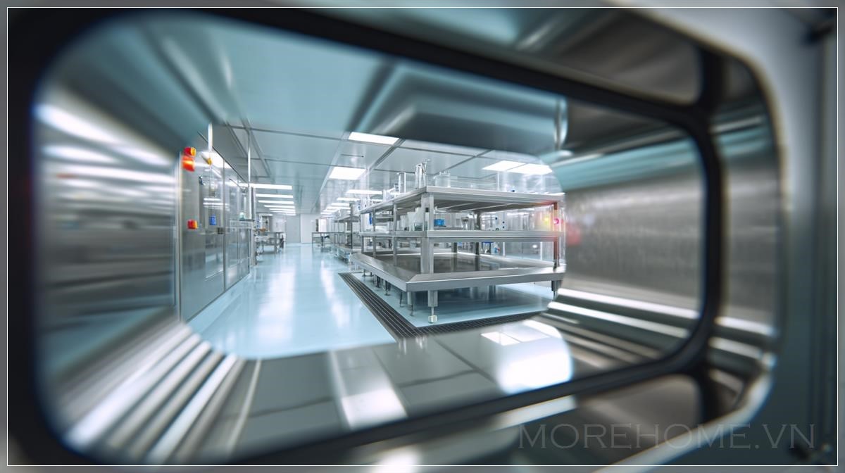 Hình ảnh POV từ bên trong hộp vận chuyển nhiệt công nghệ cao, nhìn qua một màn hình kỹ thuật số nhỏ, là một ví dụ hoàn hảo về cách kết hợp các yếu tố nghệ thuật và công nghệ. Bức ảnh này không chỉ tạo ra một không gian phòng thí nghiệm sạch sẽ và hiện đại, mà còn phản ánh một sự kết hợp tinh tế giữa thực tế và ảo ảnh qua việc sử dụng hiệu ứng ống kính góc rộng bị biến dạng. Các chi tiết như kệ inox, ánh sáng trên trần và phản chiếu ánh sáng trong môi trường phòng thí nghiệm mang đến cảm giác chân thực và sống động. Đây là một bức tranh số cực kỳ chi tiết, thể hiện sự kết hợp giữa nghệ thuật hiện thực và yếu tố trừu tượng.