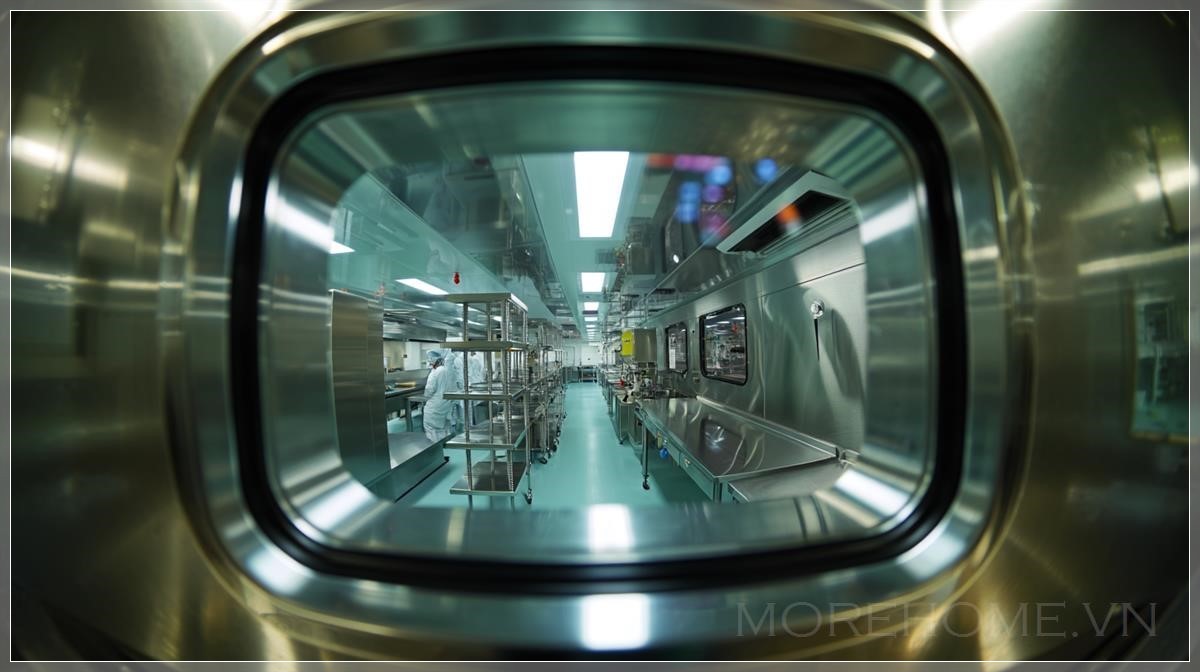 Việc sử dụng các yếu tố như độ sâu trường ảnh nông và hiệu ứng biến dạng ống kính không chỉ giúp tạo ra một cái nhìn độc đáo, mà còn khiến người xem cảm nhận được một sự kết nối trực tiếp với không gian qua một phương tiện kỹ thuật số. Hình ảnh này như thể đưa người xem vào bên trong môi trường phòng thí nghiệm, một không gian được tạo ra từ ánh sáng và vật liệu lạnh lẽo của inox, mang đến một cảm giác nhẹ nhàng nhưng không kém phần mạnh mẽ. Tính chân thực trong phản chiếu và ánh sáng chính là điểm nhấn nổi bật của tác phẩm này, giúp người xem cảm nhận được sự hiện diện của công nghệ trong từng chi tiết nhỏ nhất.