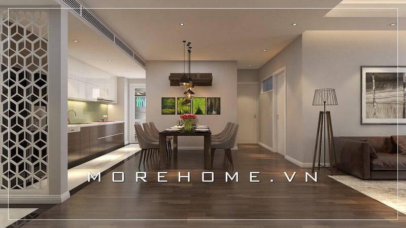 Thiết kế bố cục phòng khách chung cư đơn giản liền phòng ăn và bếp mang đến sự liền mạch, tiện lợi mang phong cách hiện đại.