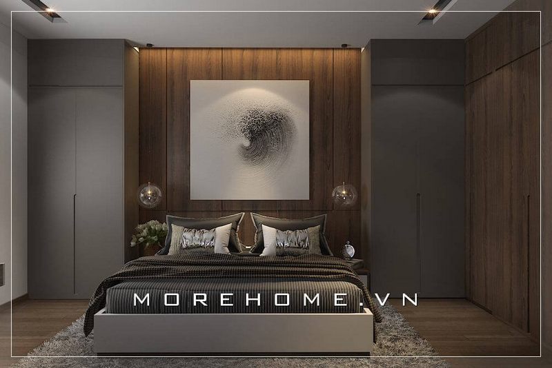 Thiết kế giường ngủ chung cư hiện đại kết hợp gam màu xám chủ đạo tạo điểm nhấn lạ mắt cũng như cảm giác thoải mái nhất cho mỗi giấc ngủ sâu